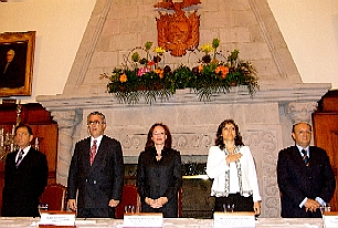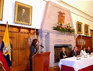EN REPRESENTACIóN DEL SEÑOR PRESIDENTE RAFAEL CORREA PARTICIPó EL MINISTRO COORDINADOR DE LA SEGURIDAD INTERNA Y EXTERNA, DOCTOR FERNANDO BUSTAMANTE, QUIEN PRESENTó UN SALUDO EN SU NOMBRE. SE CONTó CON LA PRESENCIA DE LA SEÑORA MINISTRA MARíA FERNANDA ESPINOSA, Y DE UN GRAN N&úacute;MERO DE AUTORIDADES NACIONALES, CUERPO DIPLOMáTICO, ASí COMO UNA AMPLIA PARTICIPACIóN DE LOS MIEMBROS DEL SERVICIO EXTERIOR. HUBO CIERTO DESENCANTO POR LA AUSENCIA DEL MáXIMO JEFE DE LA DIPLOMACIA, QUE INICIALMENTE HABíA CONFIRMADO SU PRESENCIA, Y DE OTROS MINISTROS DE ESTADO.